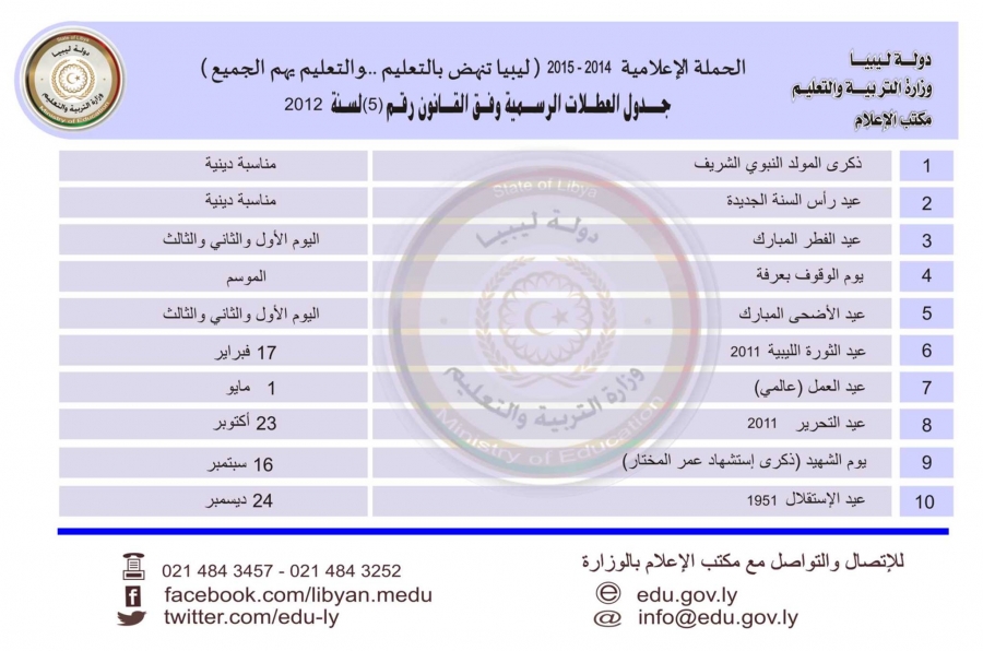 Public holidays as per Law 5 of 2012.