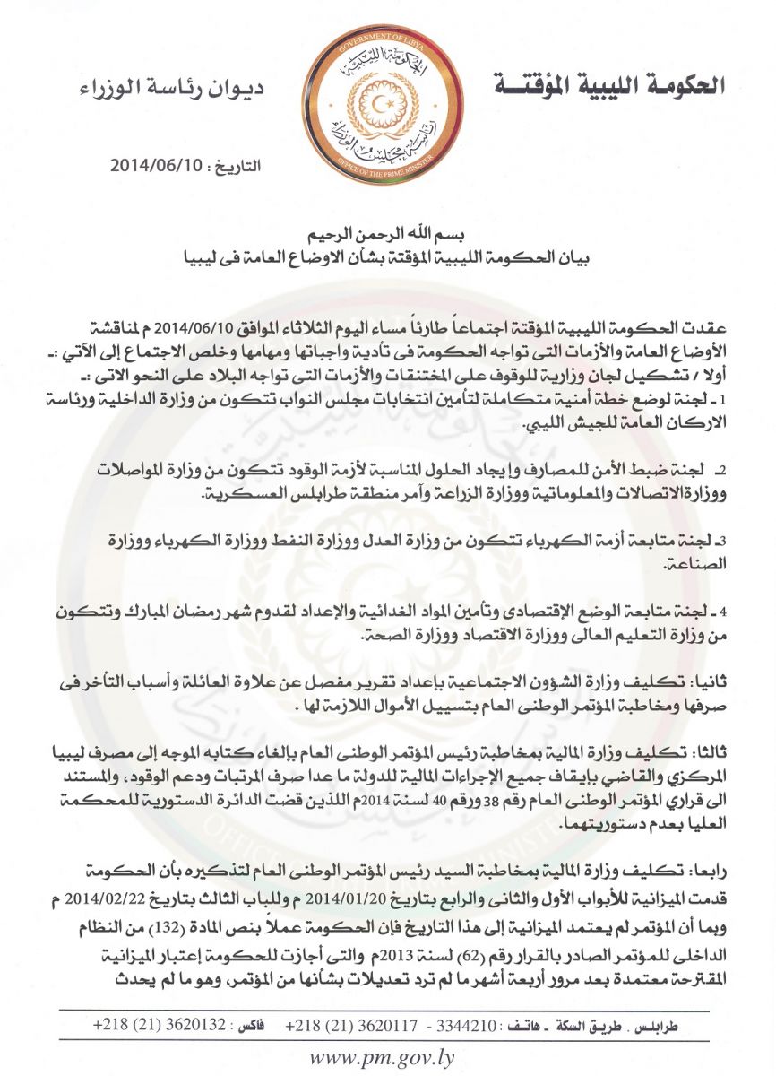 A statement issued by al-Thanay’s government on 10 June 2014.